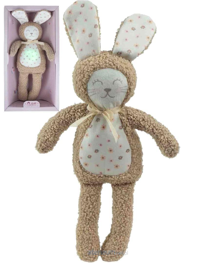Króliczek Mochy firmy Munecas Arias. Króliczkowi po naciśnięciu na jedną łapkę oświeca się brzuszek, a po naciśnięciu na drugą łapkę włącza się melodia. Wysokość króliczka 34cm. Produkt ładnie zapakowany.