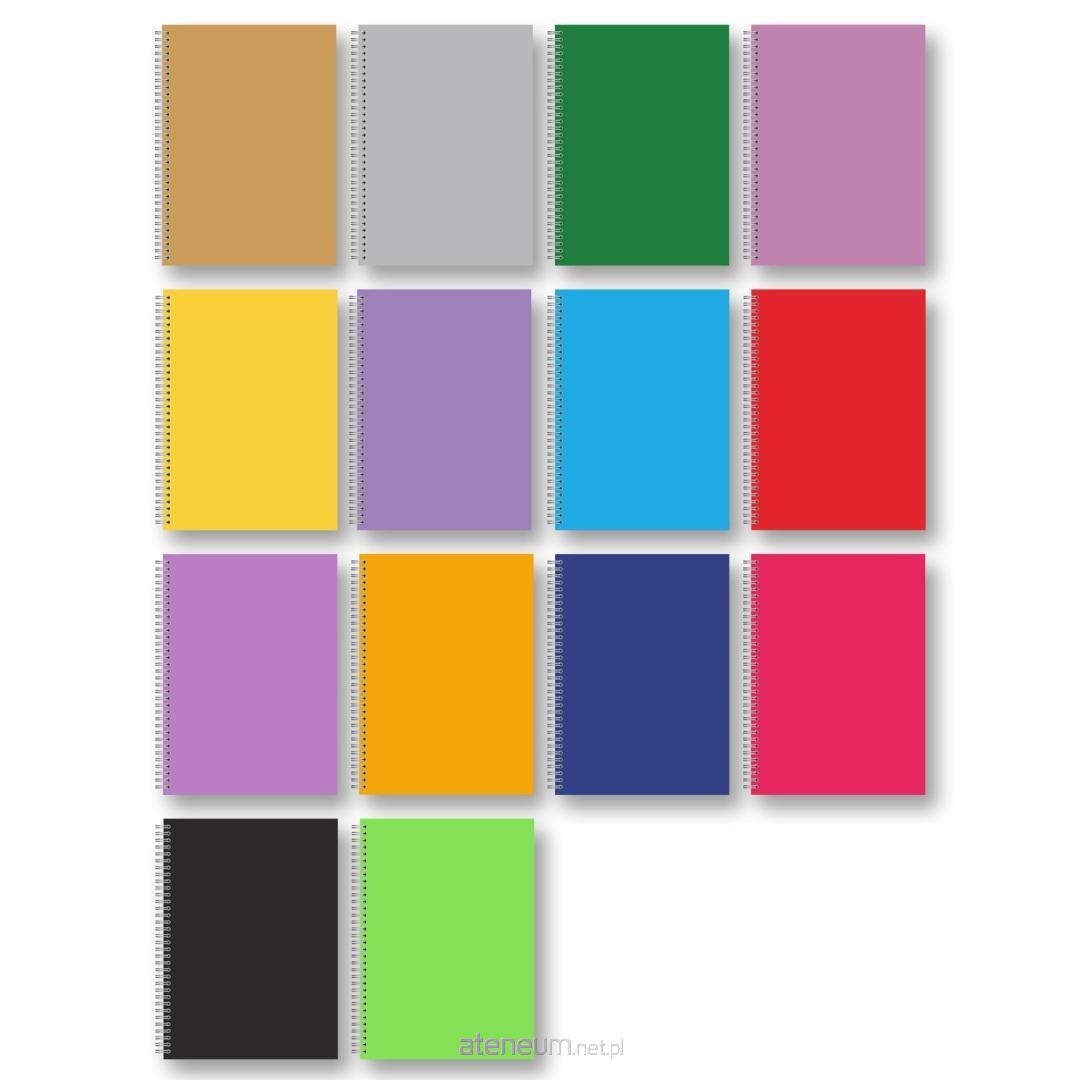 Twarda oprawa z tektury 1,5 mm , gramatura papieru w kratkę 70 g. Okleina w jednolitym kolorze uszlachetniona błyszczącą folią polipropylenową. Spirala zamocowana na dłuższym boku, Wymiar A7 w cm; 8,2X10,6