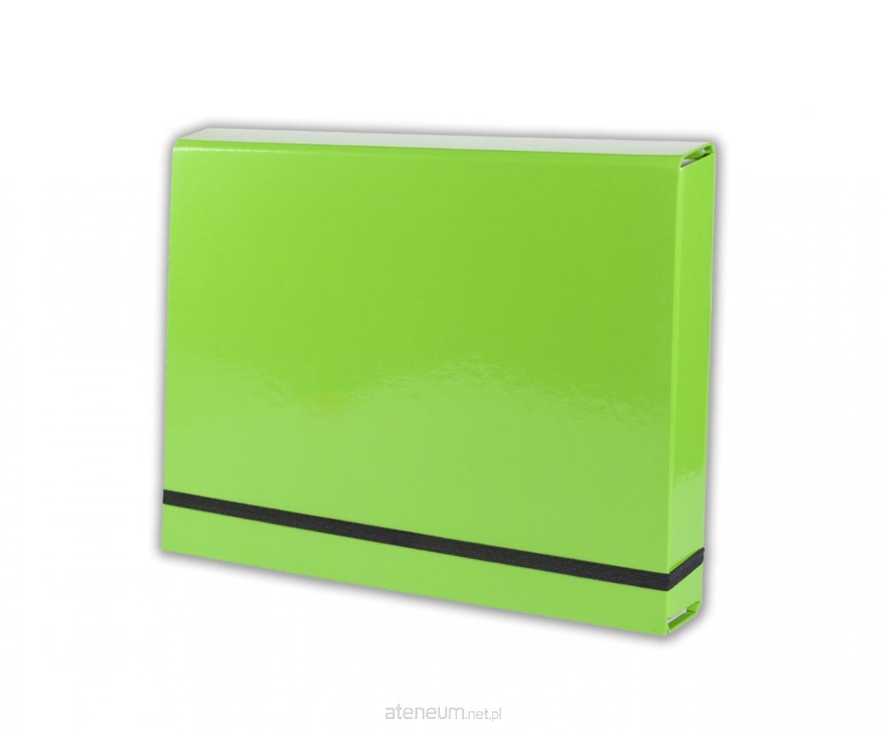 Wykonana z tektury 1,7mm, nitowane boki z okleinowanymi krawędziami, zapinana na płaską gumkę 10 mm. Okleina w jednolitym kolorze uszlachetniona błyszczącą folią polipropylenową. Wymiary w cm; 32X23,5X4,5