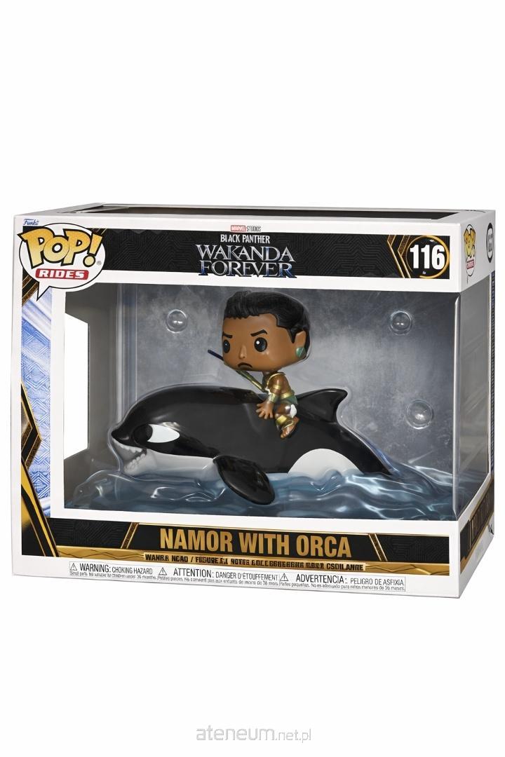 Figurka Funko POP! Rides: Namor with Orca #116 z filmu "Black Panther: Wakanda Forever". Przedstawia Namora jadącego na orce w efektownej scenie. Wykonana z winylu, typu bobble-head. Zapakowana w kolekcjonerskie pudełko z okienkiem. Idealna dla fanów Marvela i kolekcjonerów Funko POP!.