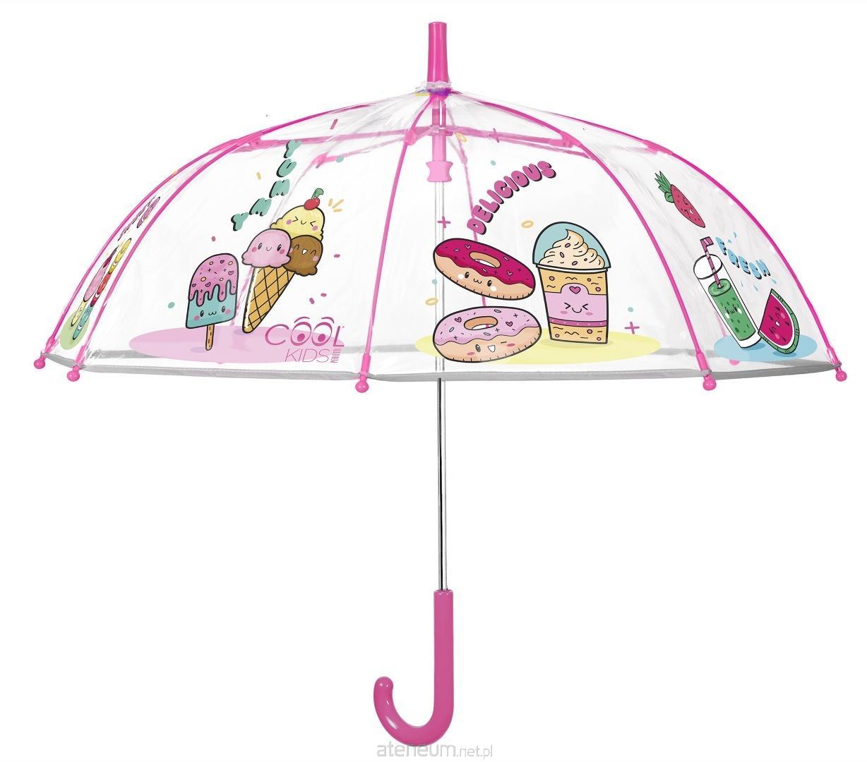 Przezroczysta parasolka dziecięca z kolorowym motywem słodkich przekąsek to radosny i praktyczny dodatek na deszczowe dni. Na czaszy znajdują się zabawne grafiki przedstawiające m.in. lody, pączki, shake oraz arbuza, które nadają parasolce wyjątkowo wesoły i przyciągający wzrok charakter. Całość uzupełniają różowe elementy - rączka oraz końcówki szprych - które tworzą spójny i estetyczny wygląd.