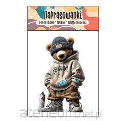 Naprasowanka prezentująca zabawną postać Misia na kolorowej deskorolce.