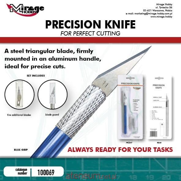 Precyzyjny nożyk modelarski. Stalowe trójkątne ostrze, mocno osadzone w aluminiowej rękojeści, idealne do precyzyjnych cięć. W zestawie opakowanie z dodatkowymi 5 ostrzami.