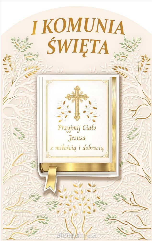 Karnet komunijny, złocony i tłoczony, naklejane elementy, tekst życzeń w środku.