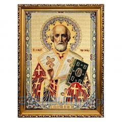 Piękne, bogate kolory oraz dostojne złote nici nadają wizerunkowi wyjątkowego blasku i podniosłości. Haftowana technika tworzy unikalną fakturę i głębię, sprawiając, że obraz jest nie tylko przedmiotem kultu, ale także artystycznym dziełem. Całość oprawiona jest w elegancką, zdobioną złotą ramę o szerokości około 3 cm, która doskonale podkreśla sakralny charakter dzieła.