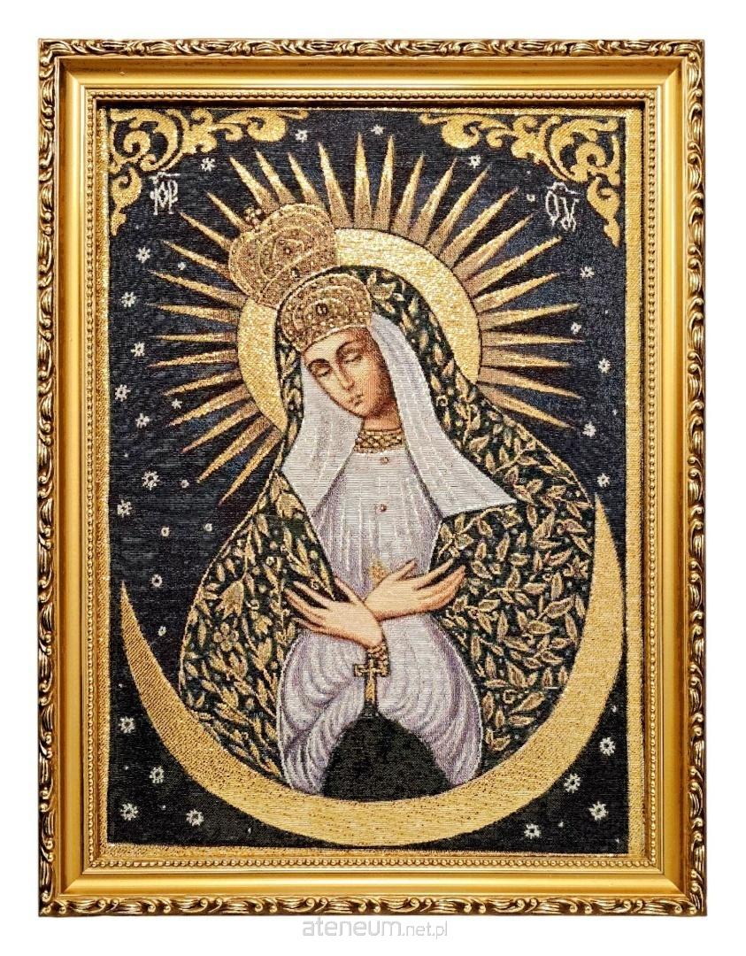 Ten kunsztownie wykonany obraz Matki Boskiej Ostrobramskiej to połączenie wysokiej wartości artystycznej z głęboką duchowością. Ciemna kolorystyka tła sprawia, że obraz doskonale wpisuje się w różnorodne aranżacje wnętrz - od klasycznych po nowoczesne, nadając im uroczystego tonu. Każdy detal, od splecionych dłoni po promienie wokół głowy Maryi, został oddany z dbałością o najwyższą świętość wizerunku. To idealny wybór dla tych, którzy pragną uhonorować dziedzictwo Ostrej Bramy w swoim własnym domu.