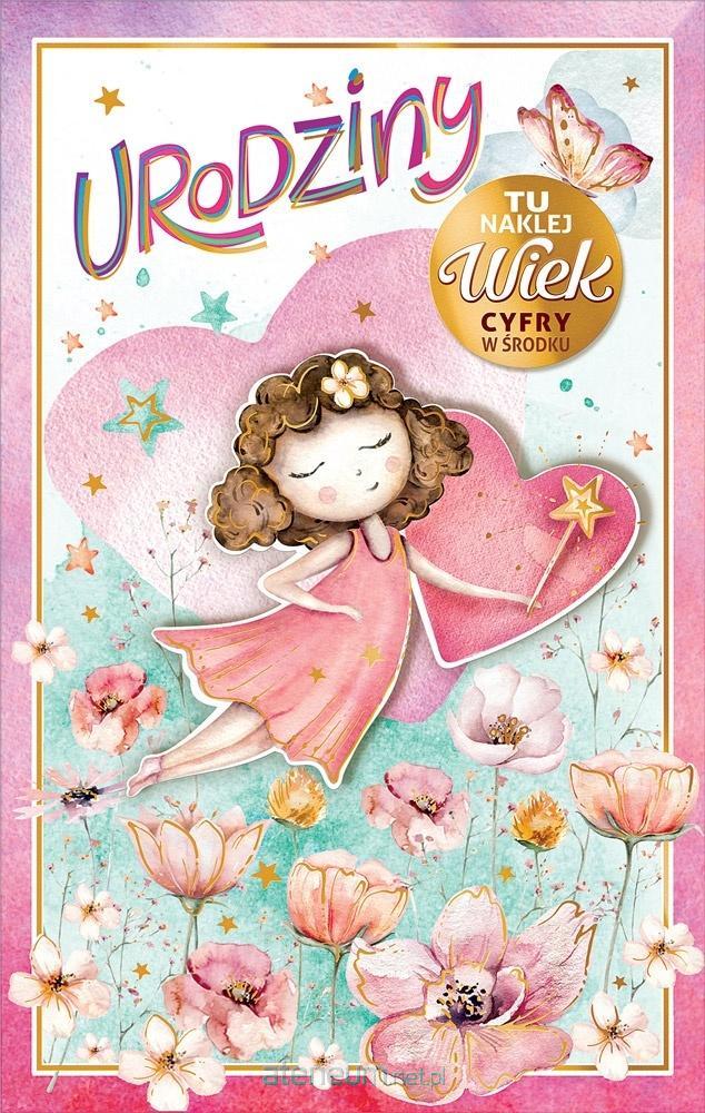 Karnet urodzinowy z życzeniami w środku, złocenie, naklejane elementy oraz naklejki z cyframi do personalizacji wieku