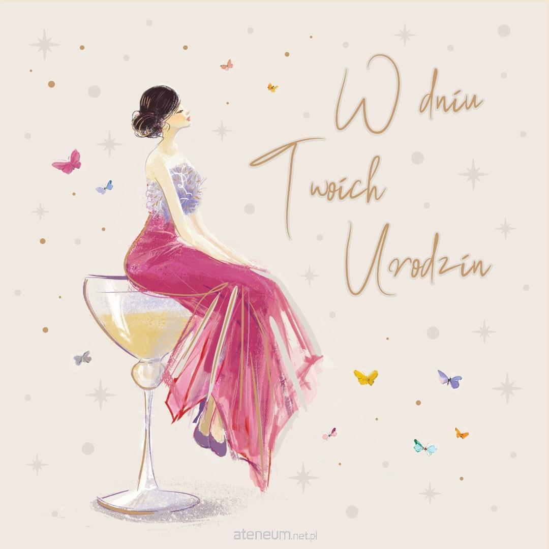 Karnet urodzinowy, złocony i tłoczony, tekst życzeń w środku.
