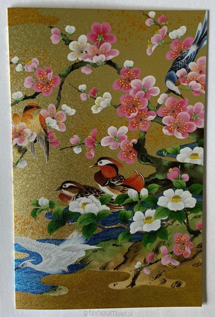 Elegancki japoński karnet premium z piękną, artystyczną ilustracją. Przedstawia urokliwy, pełen życia japoński krajobraz na złotym tle. Kompozycję tworzą kwitnące gałęzie sakury i białych kwiatów, wśród których siedzą i fruwają różnorodne ptaki: mandarynki, wróble, kolorowe ptaki egzotyczne oraz elegancki biały żuraw nad błękitną wodą. Po lewej stronie widoczna jest tradycyjna bambusowa altana ozdobiona kwiatami. Karnet w zestawie z kopertą, bez tekstu w środku.