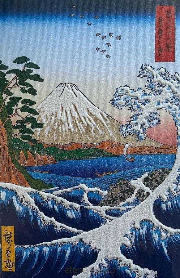 Elegancki japoński karnet premium z piękną, artystyczną ilustracją. Przedstawia majestatyczny widok na górę Fuji, która wznosi się dumnie nad wzburzonym morzem. W pierwszej planie dominują potężne, spienione fale z białymi grzywami. Na wodzie widoczne są małe łodzie rybackie, a w tle sosny na brzegu i stado ptaków na niebie. Całość tworzy klasyczną, harmonijną kompozycję ukazującą potęgę natury i spokój świętej góry Fuji. Karnet w zestawie z kopertą, bez tekstu w środku.