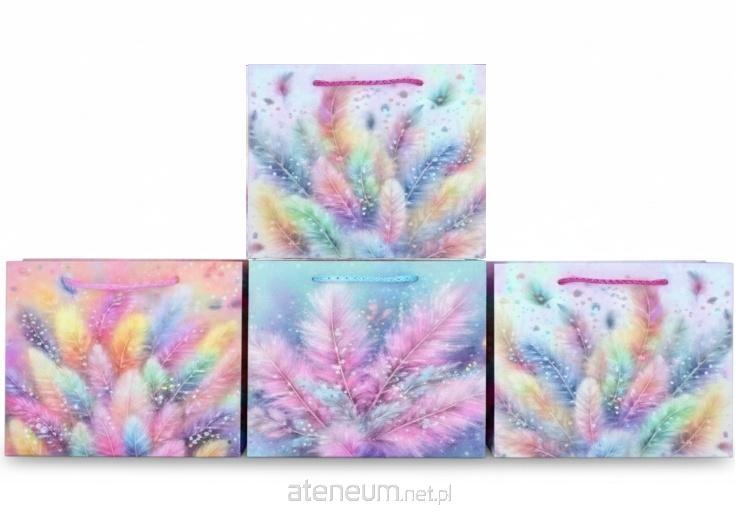 Podkreśl wyjątkowość wręczanego prezentu dzięki torebce, która sama w sobie stanowi zachwycającą dekorację. Zaprojektowana z myślą o miłośnikach subtelnej elegancji, prezentuje marzycielski motyw kolorowych piór wykonany w malarskim stylu akwarelowym. Płynne przejścia między odcieniami błękitu, różu i fioletu, przeplatane świetlistymi akcentami i delikatnymi drobinkami przypominającymi gwiezdny pył, tworzą efekt niezwykłej lekkości i magii. Wytrzymałe, kolorowe sznurki pełniące rolę uchwytów zapewniają komfort noszenia i idealnie komponują się z całością projektu. To doskonały wybór na urodziny, jubileusze czy uroczystości dla dzieci, gdzie estetyka opakowania ma za zadanie zapowiedzieć radosną zawartość i wywołać uśmiech na twarzy obdarowanej osoby jeszcze przed otwarciem upominku.