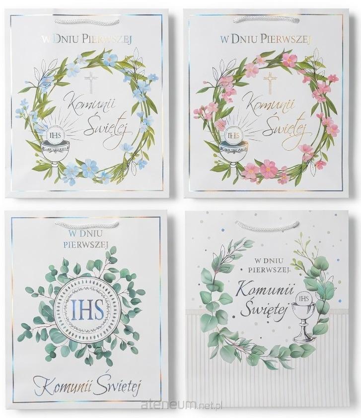 Piękne torebki prezentowe ozdobione delikatnymi wiankami z kwiatów, kielichem, hostią IHS i krzyżykiem. Dostępne w subtelnych odcieniach błękitu, różu oraz zieleni.