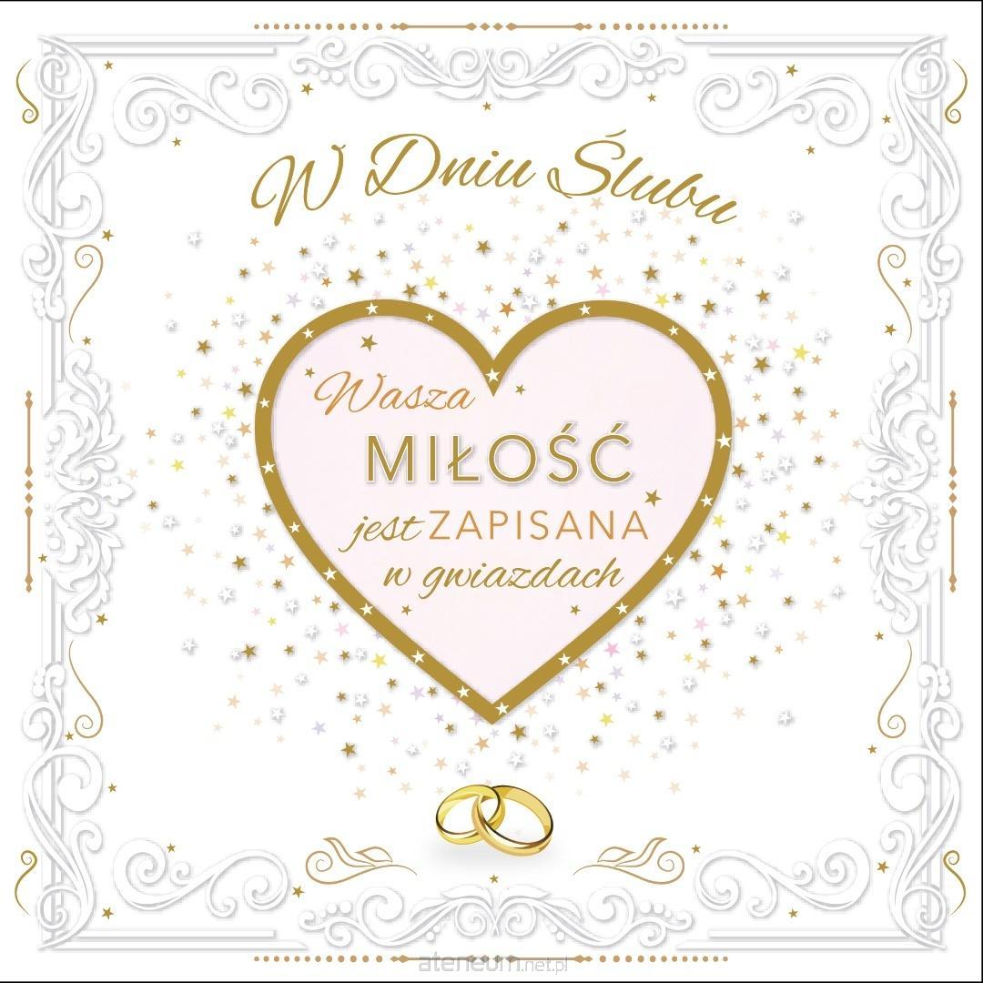 Karnet ślubny z kopertą, złocony i tłoczony, tekst życzeń w środku.