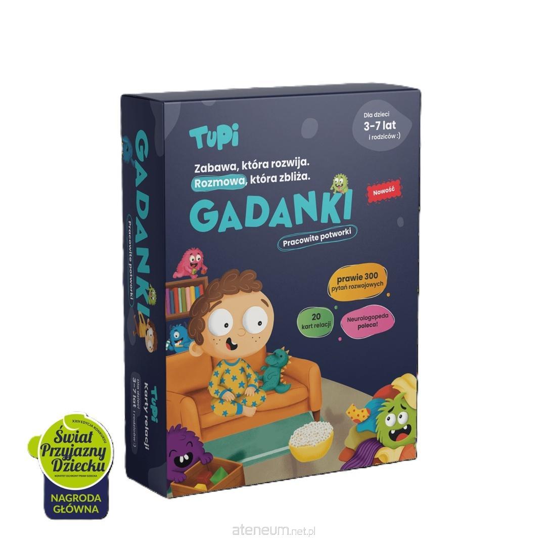 Kraina Relacji Tupi GADANKI Pracowite potworki - karty do rozmów i zabawy | Karty pomagają dziecku zrozumieć, że codzienne obowiązki nie robią się same naczynia nie wskoczą do zmywarki, a bałagan nie zniknie bez współpracy :) | GADANKI Karty relacji rozkręcają rozmowy z dzieckiem. Seria "Pracowite potworki" zachęca do rozmów o codzienności i pokazuje, jak ważna jest współpraca | Wiek: 37 lat (dla dzieci i dorosłych) | 20 dużych kart z zaokrąglonymi narożnikami | Prawie 300 pytań | Opracowane z neurologopedą | Autorskie ilustracje | Rozmiar kart: 12 18 cm | Poręczne idealne do torebki, plecaka lub samochodu | Pomysł na wartościowy prezent | Dodatkowe pomysły na aktywności w zestawie | Rozwija: mowę i słownictwo, rozumienie relacji, uważne słuchanie, oswajanie nowych sytuacji, rozpoznawanie emocji, budowanie bliskości, myślenie przyczynaskutek, komunikację | Współpraca to podstawa seria pomaga dzieciom zrozumieć, że codzienne życie to efekt wspólnej pracy i troski o siebie nawzajem | Opinia ekspertki: Pracowite potworki uczą wartości współpracy, wspierają włączanie dzieci w obowiązki i budują poczucie sprawczości. Pomagają rozwijać kompetencje społeczne i emocjonalne oraz są wsparciem dla rodziców i specjalistów.