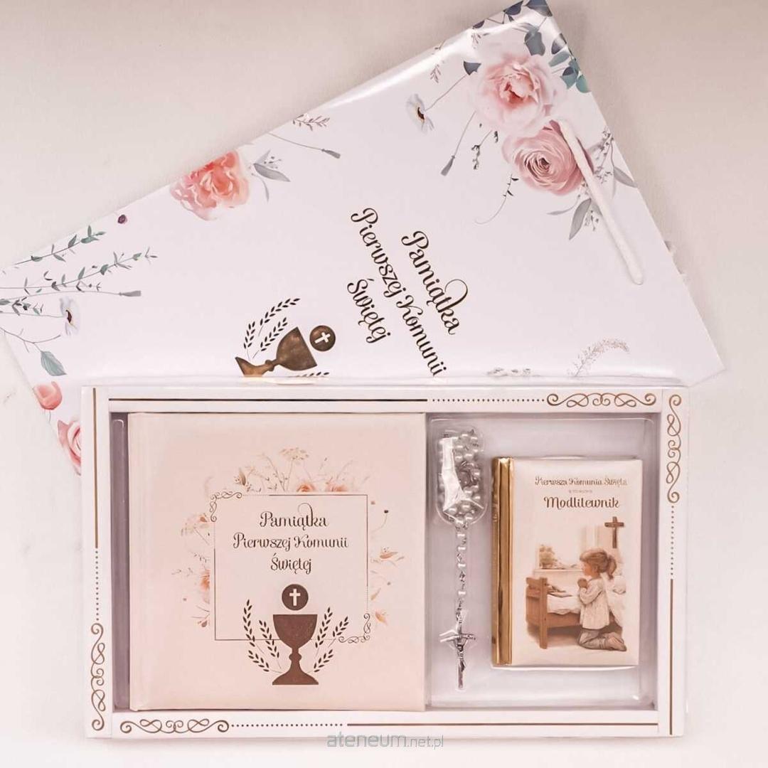Elegancko skomponowany komplet zawiera modlitewnik z najważniejszymi modlitwami, które pomogą w codziennym umacnianiu wiary, różaniec ponadczasowy symbol modlitwy i duchowej opieki oraz starannie wykonany album pamiątkowy na zdjęcia i wspomnienia z uroczystości. Wszystko to, można spakować do dołączonej torebki prezentowej.