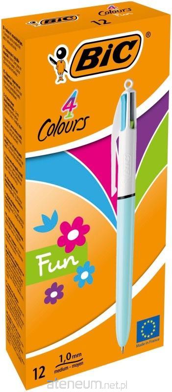 Długopis automatyczny. 4 kolory wkładu (niebieski, różowy fioletowy, oliwkowy). Kauczukowy uchwyt. Średnica końcówki 1,0 mm. Szerokość linii pisania 0,4 mm. Uchwyt na smycz. Kod kreskowy na każdym długopisie. 12 sztuk w opakowaniu zbiorczym.