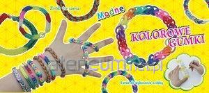 W kartonowym pudełku znajduje się zestaw do przygotowania kolorowych gumeczkowych ozdób. Zawiera on: - plastikowe krosno służy do wykonania bransoletek z pojedynczym szerokim wzorem. Dzięki niemu połączysz gumki i stworzysz wspaniałe ozdoby, - szydełko przyda się do przekładania gumek oraz do zmiany ustawienia krosna. Jeśli dysponujesz więcej niż jednym krosnem, będziesz mogła je połączyć, - minikrosno dzięki niemu przygotujesz ozdoby z pojedynczym wzorem, - kolorowe gumeczki, oraz - instrukcje zilustrowane zdjęciami, jak przygotować wspaniałe bransoletki. Uwaga: zestaw przeznaczony dla dzieci powyżej 3. roku życia.