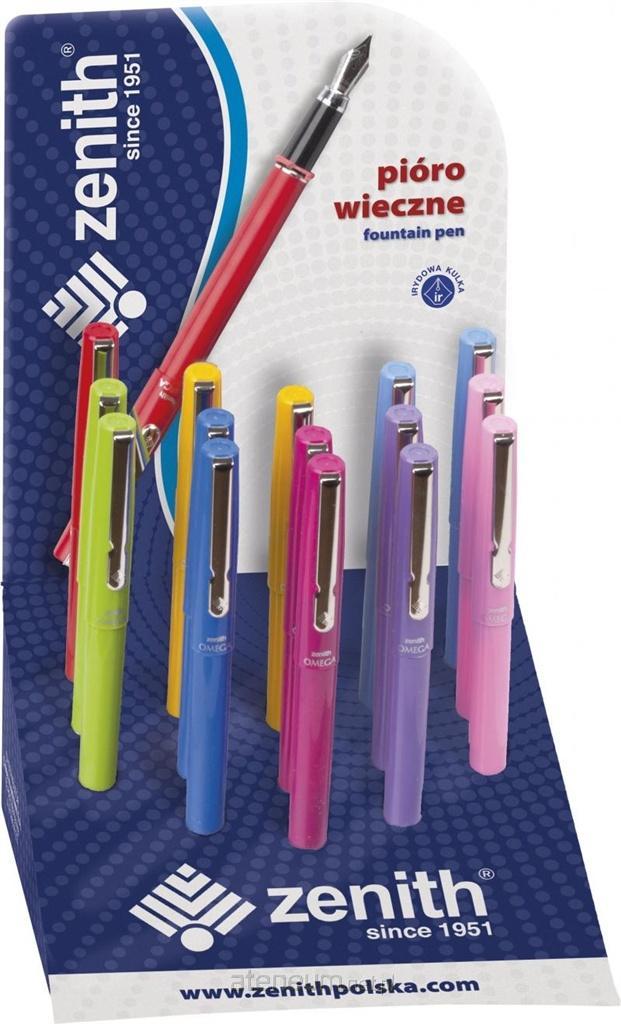 Stylowe pióro wieczne z nowym, eleganckim wykończeniem. Klips, stalówka oraz obrączka korpusu pokryte wysokiej jakości powłoką niklową, stalówka zakończona irydową kulką dla zapewnienia doskonałej jakości i łatwości pisania, wymienne naboje atramentowe Zenith. Display 15 sztuk + 1 sztuka gratis, mix kolorów.