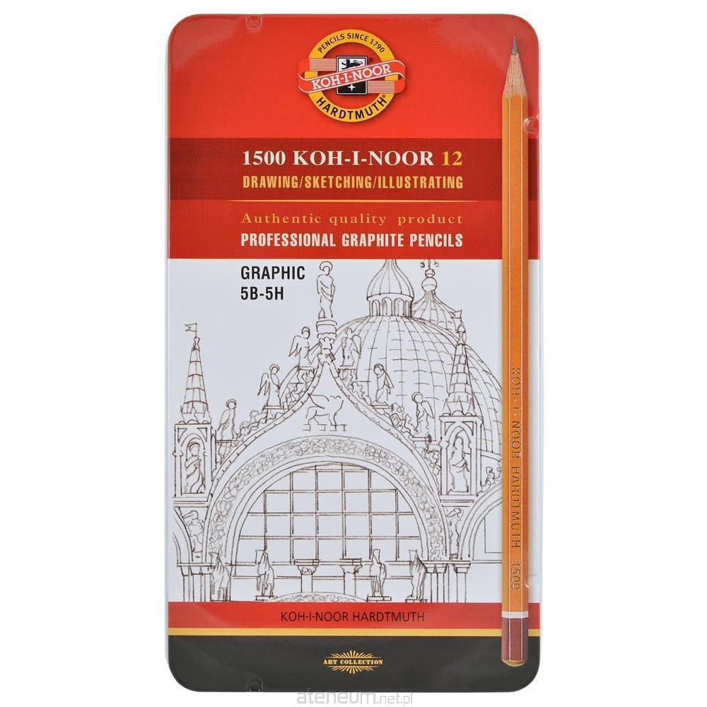 Zestaw artystycznych ołówków Koh-I-Noor 1502. Ołówki grafitowe Koh-I-Noor od dziesiecioleci cieszą się światową reputacją jako synonim jakości. Seria 1500 produkowana jest w 20 stopniowej wyjątkowo precyzyjnej skali gradacji, wyróżniają się wysoką transparentnością i łatwym usówaniem. Oprawki cedrowe tych sześciobocznych ołówków są wielokrotnie lakierowane. Zestaw artystyczny zawiera 12 ołówków średniej gradacji w metalowej kasecie od 5B do 5H polecane głównie grafikom do szkicowania, cieniowania oraz rysowania konturów.