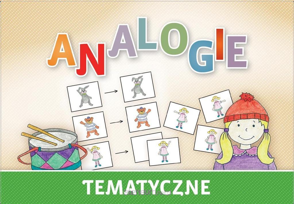 Analogie Tematyczne Myślenie przez analogię pozwala odszukać odpowiadające sobie właściwości dla różnych cech, rzeczy, sytuacji, procesów itp. Umożliwia rozwiązywanie problemów poprzez przeniesienie wiedzy z jednej sytuacji na drugą. Rozumowanie przez analogię polega na dostrzeżeniu reguły i wykorzystaniu jej do rozwiązania innych zadań w nowych sytuacjach. Ćwiczenie myślenia przez analogię jest ważnym etapem nauki i rozwoju intelektualnego. Brak tej umiejętności utrudnia uczenie się nowych umiejętności, także językowych.. Ćwiczenia Analogie przeznaczone są zarówno dla dzieci z zaburzeniami rozwojowymi, jak i dla dzieci zdrowych, w celu stymulacji kształtowania funkcji poznawczych. Zadania zawarte w kartach ćwiczeń można wykorzystywać do codziennej pracy w gabinetach logopedycznych i terapeutycznych oraz w przedszkolach i szkołach. Rozwijają one u dzieci takie umiejętności, jak: - odkrywanie i wykorzystywanie reguł, - werbalizowanie reguł, - odnajdywanie relacji i różnic, - dokonywanie analizy. Karty ćwiczeń zostały podzielone według zastosowanych reguł oraz stopnia ich trudności. Dla każdej analogii przygotowano kilka ćwiczeń, aby dziecko mogło przyswoić daną regułę i przenieść ją na inne zadania, a w konsekwencji samodzielnie odszukiwać kolejne prawidłowości. Nawet jeśli dziecku nie uda się rozwiązać pierwszego problemu, kolejnych kilka kart, wykorzystujących tę samą regułę pozwoli na jej opanowanie i doświadczenie pozytywnych emocji poprzez samodzielne wykonanie ćwiczenia. Karty zostały przygotowane w taki sposób, by dziecko mogło dołożyć ruchomy obrazek w odpowiednie okienko. Do każdej analogii dziecko ma za zadanie wybrać jedno z pięciu przedstawionych rozwiązań, wśród których tylko jedno jest prawidłowe. Przy pierwszej analogii terapeuta pyta dziecko pokazując na puste okienko: Co tu pasuje? Wszystkie analogie opierają się na zasadzie: Jeśli A, to B, np. jeśli czerwony miś zamienia się w żółtego misia, to czerwone auto zamieni się w żółte auto. W powyższym przykładzie dziecko ma za zadanie uświadomić sobie regułę. Mówiące dzieci należy zachęcać do werbalizowania reguł. Osoby z zaburzeniami komunikacji językowej po wykonaniu zadania powinny usłyszeć wypowiedzianą przez dorosłego zasadę. Zawartość zestawu -70 kart kartonowych kolorowych dwustronnie foliowanych - instrukcję z odpowiedziami - tekturowe opakowanie