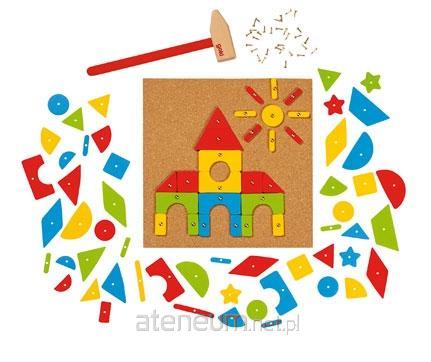 Zestaw do tworzenia kształtów z kolorowych figur. Za pomocą młotka należy przybijać je do korkowej planszy, a powstaną obrazki, jakie tylko podpowie wyobraźnia. Zestaw zawiera 118 elementów. Opakowanie zawiera: planszę korkową, różnokolorowe drewniane elementy z dziurkami, metalowe pinezki do przybijania, drewniany młotek oraz kartę z wzorami.