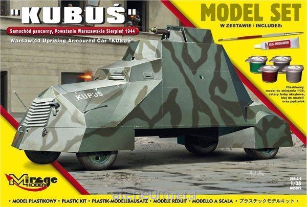 "Kubuś" - Improwizowany Samochód Pancerny został skonstruowany i zbudowany przez Powstańców Warszawskich jako jedna z niewielu tego typu konstrukcji powstałych w oblężonym mieście ogarniętym powstaniem zbrojnym. Jako taki należy do nielicznych tego typu konstrukcji powstałych na świecie w okresie II wojny światowej. Powstał wysiłkiem grupy żołnierzy Zgrupowania Armi Krajowej "Krybar" w okresie od 8 do 23 sierpnia 1944 r. w warsztatach Elektrowni Warszawskiej na Powiślu. W zestawie: - Plastikowy model do sklejania 1/35 - Cztery farby akrylowe, - Klej do modeli - Pędzelek