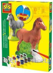 Odlewy gipsowe do samodzielnego wykonania. Duża forma z 14 wzorami do zrobienia reliefów z motywem koni. W zestawie również kolorowe farby, błyszczący brokat, pędzelek, gips plastyczny.