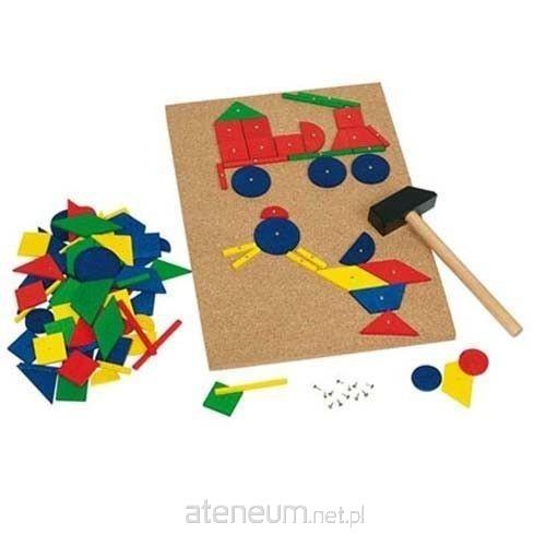 Zestaw zawiera 102 elementy do tworzenia kształtów z kolorowych figur. Za pomocą młotka należy przybijać je do korkowej planszy, a powstaną obrazki, jakie tylko podpowie wyobraźnia.