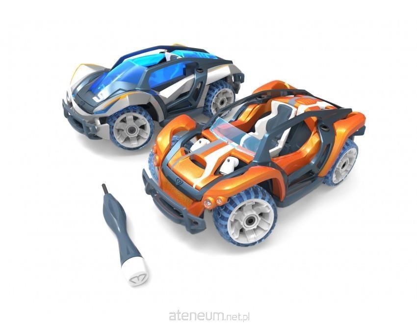 pomarańczowa maska i błotniki samochodu terenowego, niebieska zabudowana maska i srebrny błotnik drogowej wyścigówki, rama samochodu terenowego, podwozie samochodu terenowego, siedzenie, 4 koła, 2 zawieszenia, opakowanie zawiera łatwy w obsłudze śrubokręt.