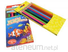 Kredki ołówkowe grube, 12 kolorów o trójkątnym kształcie. Ergonomiczny kształt umożliwia pewne trzymanie i ułatwia rysowanie. Miękki wzmocniony grafit ułatwia kolorowanie. Lakierowanie obwoluty kredek zgodnie z kolorem grafitu. Wszystkie kredki oryginalnie zatemperowane i gotowe do użycia. Pakowane w kolorowe kartoniki z okienkiem i zawieszką. W każdym pudełku temperówka i złota kredka.