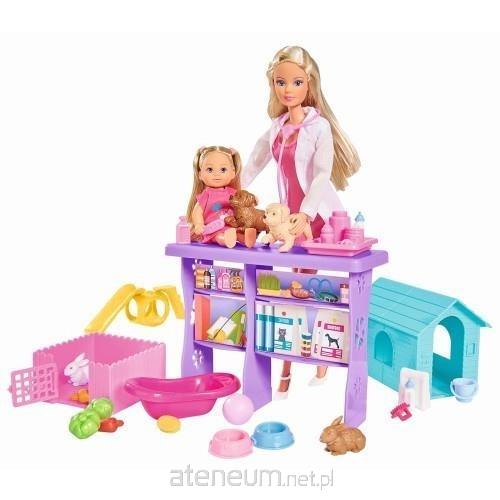 Steffi i Evi z 4 zwierzątkami,stołem, budą dla psa, klatką dla królika, placem zabaw i wieloma innymi akcesoriami, 35 elementów, 29cm Steffi, 12cm Evi.