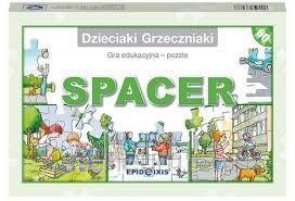 Dzieciaki Grzeczniaki Spacer to prosta, a jednocześnie atrakcyjna gra edukacyjna należąca do serii Dzieciaki Grzeczniaki, przeznaczona dla dzieci w wieku przedszkolnym i wczesnoszkolnym. Gry z tej serii mogą być wykorzystywane przez rodziców do zabaw z dziećmi w domu, jak również mogą być używane przez pedagogów i psychologów jako narzędzie edukacyjno-terapeutyczne w przedszkolu, szkole, świetlicy, placówce wychowawczej. Dzieciaki Grzeczniaki Spacer oparte są na układaniu 60-elementowych puzzli, które po złożeniu tworzą serię scenek znanych dzieciom z codziennego życia. Gry te służą rozwijaniu i wzmacnianiu umiejętności społecznych. Układając puzzle dziecko w trakcie zabawy dowiaduje się, jakie zachowania są właściwe i poprawne. Ćwiczy także umiejętność koncentracji uwagi i współpracy z innymi graczami. Ułożone obrazki mogą być punktem wyjścia do rozmowy z dziećmi na temat właściwych zachowań w domu i różnych miejscach publicznych, w trakcie zabaw z rówieśnikami oraz w kontakcie z osobami dorosłymi. Założeniem serii jest przekazywanie dzieciom pozytywnych wzorców zachowania. Forma gry sprzyja łatwiejszemu ich przyswajaniu, a bohaterowie barwnych ilustracji, które ukazują sytuacje znane z życia codziennego, są postaciami, z którymi dziecko łatwo może się utożsamić. Dzięki temu przedstawione wzorce zachowań na długo zostają w pamięci małych graczy. Na serię Dzieciaki Grzeczniaki składają się tytuły: Dom Obiad Spacer Plac zabaw Zakupy (w przygotowaniu) Kino (w przygotowaniu) Każda część to: 60 puzzli bawełniany woreczek do ich przechowywania instrukcja zawierająca propozycje zabaw z wykorzystaniem ułożonych obrazków Część Dzieciaki Grzeczniaki Spacer przedstawia następujące scenki: idziemy obok mamy albo taty po chodniku pozdrawiamy znajome osoby przechodzimy przez jezdnię w wyznaczonych miejscach wrzucamy śmieci do kosza dbamy o zwierzęta dbamy o rośliny Po połączeniu wszystkich elementów i ilustracji w jedną dużą planszę warto razem z dziećmi omówić sytuacje przedstawione na obrazkach. Możemy też zaproponować dzieciom inne zabawy związane z kształtowaniem poprawnych i kulturalnych zachowań podczas spaceru; przykłady takich zabaw znajdują się w instrukcji. Autorką pomysłu serii Dzieciaki Grzeczniaki jest Joanna Grych, psycholog i pedagog pracujący na co dzień z dziećmi i młodzieżą z zaburzeniami emocjonalnymi, autyzmem, zespołem Aspergera; prowadzi zajęcia indywidualne i grupowe w zakresie usprawniania umiejętności poznawczych oraz społecznych.
