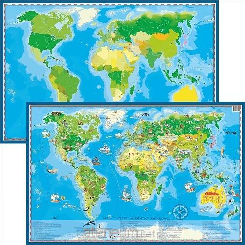 Geograficzna podkładka z mapą świata dla dzieci, pełniąca rolę edukacyjną oraz dekoracyjną. Zaznaczono na niej barwnie kontynenty wraz z ukształtowaniem terenu, jak też za pomocą kolorowych piktogramów najbardziej znane budowle świata, zwierzęta, pomniki przyrody, wydarzenia. Dzięki temu mapa jest fascynującym źródłem wiedzy o historii i teraźniejszości naszej planety. Przekazuje w ciekawy sposób informacje z zakresu geografii, przyrody i kultury. Pobudza wyobraźnię, zachęca do zdobywania wiedzy i inspiruje. Jest również świetnym pretekstem do spędzania w twórczy sposób wspólnego czasu rodziców z dziećmi. Jakość i estetyka wykonania sprawiają, że stanowi ozdobę dziecinnego pokoju. Druga strona podkładki przedstawia mapę polityczną bez piktogramów z zaznaczonymi punktami odpowiadającymi umiejscowieniu stolic poszczególnych państw. Dzięki temu mapa służy jako idealne narzędzie do nauki geografii. Poszczególne punkty i państwa można opisywać za pomocą mazaków suchościeralnych, a pokrycie laminatem zapewnia trwałość mapy.