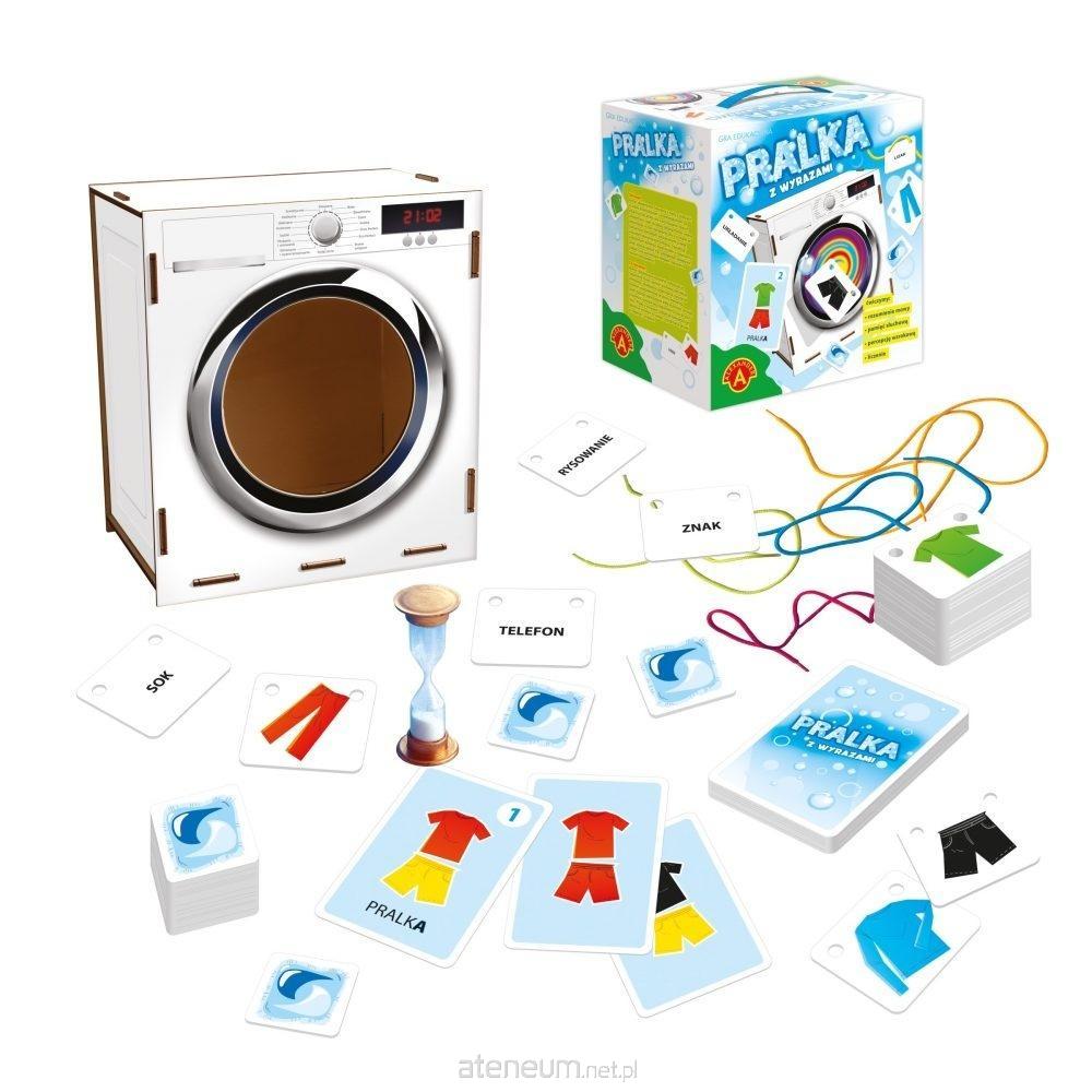 Pralka to wyjątkowa gra edukacyjna z nietuzinkowymi rekwizytami. W zestawie znajdziemy trójwymiarową drewnianą pralkę o wymiarach 19 x 21 x 12 cm. Dziecko umieszcza kartoniki z wyselekcjonowanymi strojami w środku pralki. Po umownym procesie prania, następuje rozwieszanie ubranek. Kartoniki mają specjalne otwory umożliwiające ich nawlekanie na załączone w zestawie sznurki. Cała zabawa jest pretekstem do ćwiczeń poprawnej wymowy, głoskowania, sylabowania, pamięci słuchowej, percepcji wzrokowej, umiejętności przeliczania, wyodrębniania ze zbioru.
