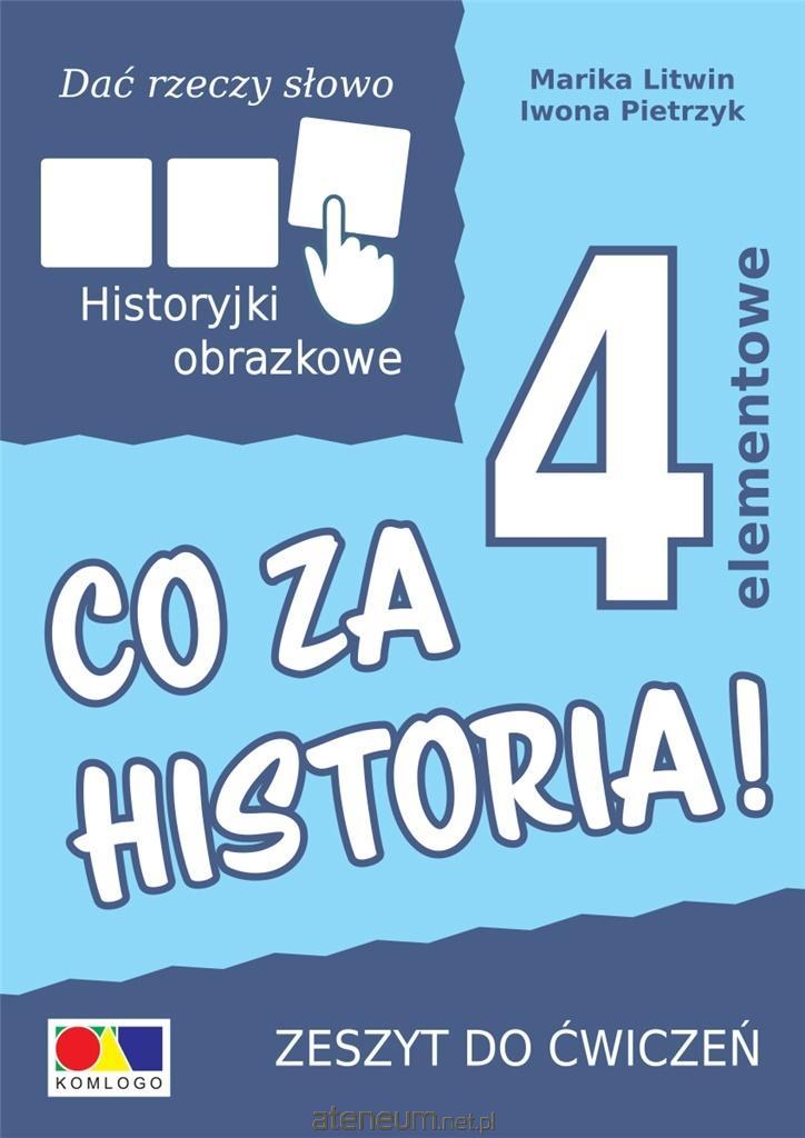 Co za historia! - ćwiczenia do historyjek 4-elementowych Co za historia! to zeszyt ćwiczeń z zadaniami z zakresu doboru słów, układania zdań oraz umiejętności przekształcania form gramatycznych, do 4-elementowych historyjek obrazkowych Dać rzeczy słowo. Pomoc służy do terapii afazji, a także do pracy z dziećmi z zaburzeniami rozwoju językowego.