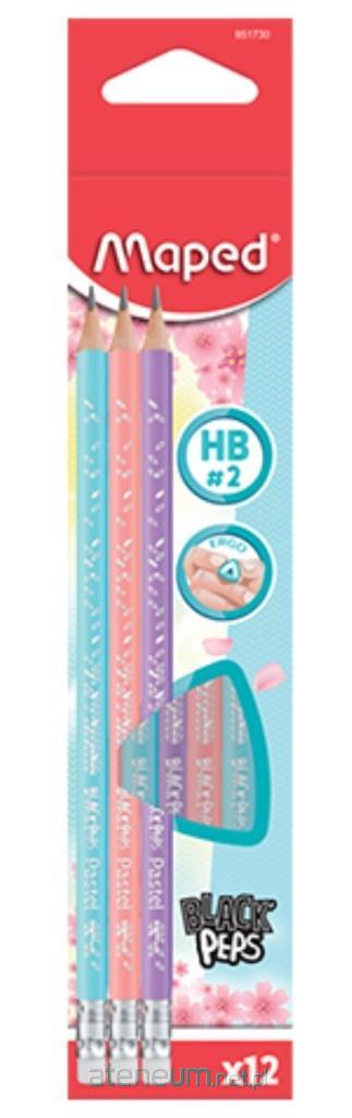 Opakowanie zbiorcze 12 szt Ołówki Black'Peps Pastel o twardości HB. Wykonane z drewna lipowego. Gumka w kolorze białym. Trójkątny przekrój. Grafit odporny na złamania. Dostępne w 3 kolorach pastelowych: turkusowym, koralowym i fioletowym z nadrukowanymi metalicznymi wzorami. w pudełku miks 3 kolorów.
