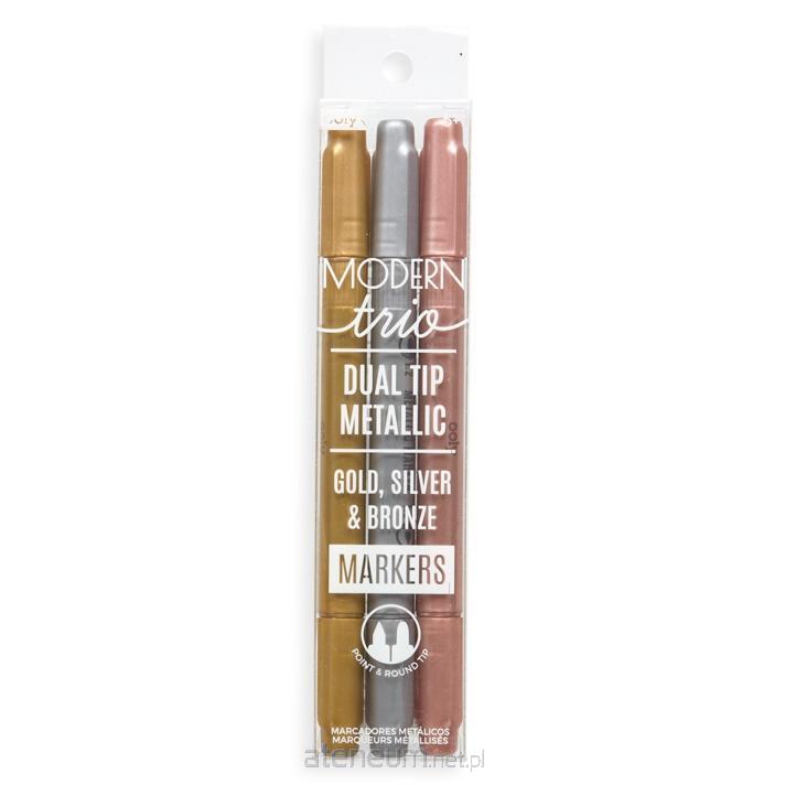 Zestaw 3 dwustronnych markerów z metalicznym tuszem w kolorze złota, srebra i brązu. Każdy posiada dwie końcówki: ściętą i okrągłą. Markerów można używać do pisania na białym i czarnym papierze a także na szkle, ceramice, drewnie i innych tworzywach. Napisy i obrazki z gładkich powierzchni usuniesz wodą. Na drewnie i powierzchniach porowatych efekt jest trwały. Masz dość niebieskich i czarnych notatek, czerwień i zieleń straciły swą moc a neonowych markerów nie tolerujesz? Pozwól sobie na odrobinę szaleństwa połączonego z nutą blichtru. Sięgnij po flamastry Ooly Modern Trio wypełnione tuszami w kolorze szlachetnych metali. Wprowadzą nieco blasku i luksusu nawet do listy zakupów. To doskonały zestaw dla kreatywnych dusz, które nie tylko dużo piszą i planują, ale także z pasją tworzą napisy, rysunki na wszelkich dostępnych powierzchniach. Flamastry Modern zapewnią dużą swobodę. Dzięki nim kubek porannej kawy może zyskać codziennie nowe motto a na lustrze pojawi się sympatyczna buźka życząca domownikom miłego dnia. Z każdej gładkiej powierzchni flamastry zmyjesz wodą, a jeżeli zechcesz uzyskać trwalszy efekt użyj ich na drewnie lub innej porowatej powierzchni. By praca i zabawa z markerami Ooly Dual Tip była jeszcze bardziej kreatywna i przyjemna, każdy posiada dwie końców ? cieńszą, spiczastą idealną do detali oraz nieco grubszą zaokrągloną. Duet idealny. Flamastry metaliczne Ooly Modern Trio Dual Tip: idealny pomysł na gustowny prezent; 3 dwustronne flamastry ? 1 złoty, 1 srebrny, 1 metaliczny brąz; Jeden mazak dwie końcowi ? spiczasta 1.0 i okrągła 1.2; można pisać na białym i czarnym papierze; można pisać na szkle, drewnie, kubkach itp.; z gładkich powierzchni zmywalne wodą; trwały efekt na drewnie i powierzchniach porowatych; są idealnym dopełnieniem kredek, ołówków i wiecznych piór serii Ooly Modern.