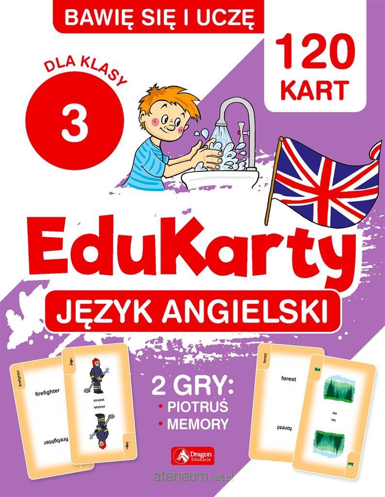 EduKarty. Język angielski to pomoc w nauce słownictwa języka angielskiego dla dzieci w klasach od zerówki do trzeciej. Zestaw przeznaczony jest do nauki w domu, w szkole i podczas kursów językowych. Zakres słownictwa obejmuje takie tematy jak części ciała, zabawki, szkoła, liczby, kolory czy pogoda. Zestaw zawiera: 120 kart, w tym 60 kart ze słówkami i 60 kart z ilustracjami. EduKarty zawierają także specjalny zestaw ćwiczeń-zabaw, które trenują mózg, aby lepiej się uczyć i łatwiej zapamiętywać materiał. 1 stronę z opisem gier i słowniczkiem