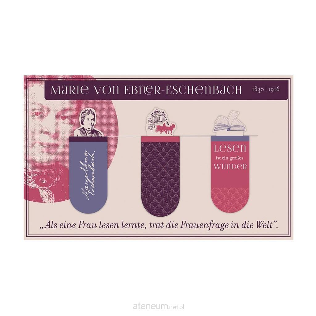 Zakładki magnetyczne - Marie von Ebner-Eschenbach Nie tylko zaznaczają strony, ale także wyglądają z książki na górze i dlatego przyciągają wzrok. Szczególnie odpowiednie dla miłośników sztuki i literatury. Trzy zakładki magnetyczne w zestawie są tematycznie skoordynowane. Każdy zestaw dotyczy znanego pisarza z minionej epoki i zawiera cytaty, odpowiednie ilustracje do słynnych dzieł lub podpis autora. Skomponuj własną kolekcję z zakładkami Goethe, Schiller lub Oskar Wilde. Wymiary: 5,5 cm x 2 cm x 0,1 cm.