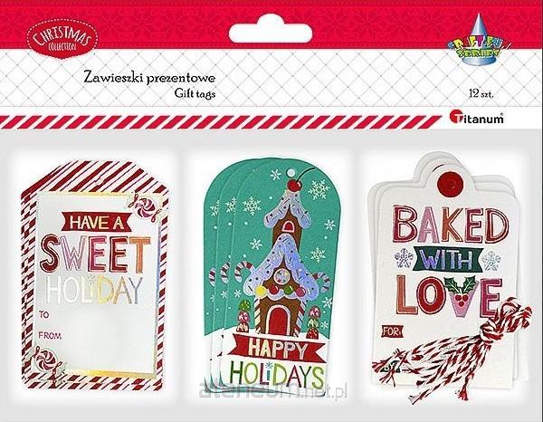 Zawieszki do prezentów wykonane z kartonu. W każdej zawieszce jest wycięty otwór na dowieszenie sznureczka. Tylna strona zawieszki nie posiada nadruku. W zestawie sznureczki w kolorze biało-czerwonym. Wymiary zawieszek: Have a Sweet Holiday - 61x98 mm, Happy Holidays - 34x98 mm, Baked with Love - 62x98 mm. Idealne do opisania wypieków na prezent.
