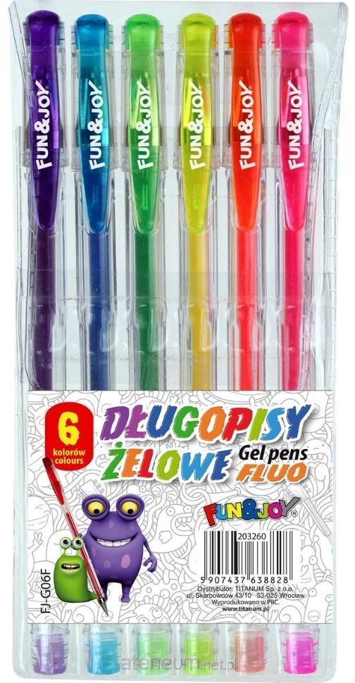 Komplet długopisów żelowych w 6 kolorach fluorescencyjnych. Przezroczysta obudowa, zatyczka w kolorze wkładu. Grubość linii pisania: 0,8 mm. Opakowanie: 6 szt.