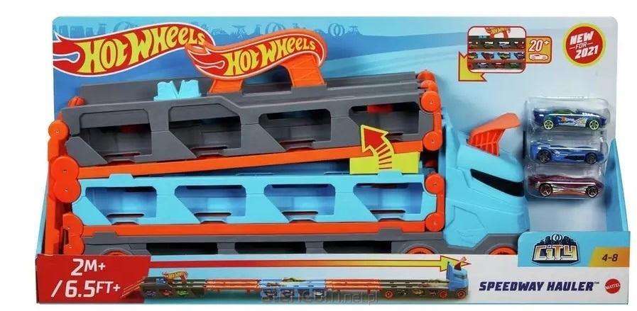 Hot Wheels Wyścigowy transporter 2w1 sprawia, że przechowywanie pojazdów i wyścigi wjeżdzają na zupełnie nowy poziom! W transporterze można przechowywać ponad 20 samochodzików Hot Wheels widać je przez małe okienka w naczepie. Czas na rajd? Po pociągnięciu za uchwyt i rozłożeniu transporter zmienia się w tor wyścigowy o długości aż 1,8 m! Przechowywane pojazdy są wciąż widoczne pod torem, a kabina ciężarówki zamienia się w podwójną wyrzutnię, która posyła dwa samochodziki w ekscytujący wyścig. Dzięki dźwigni na końcu toru pierwszy z pojazdów może ukończyć wyścig, a drugi utknie na torze! Łączy się z innymi zestawami do zabawy Hot Wheels City (sprzedawane oddzielnie) zbuduj własną rajdową trasę! Zestaw zawiera trzy samochodziki Hot Wheels w skali 1:64 oraz wielofunkcyjną ciężarówkę, która może pomieścić 20 pojazdów (sprzedawane oddzielnie). Świetna zabawa dla dzieci w wieku od 4 do 8 lat. Kolory i elementy dekoracyjne mogą się różnić.