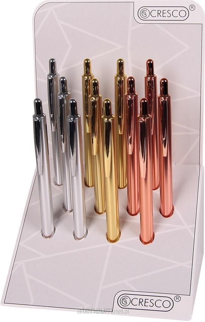 Opakowanie zbiorcze. Towar wysyłany losowo. Długopis występuje w trzech nowoczesnych kolorach. Produkt wykonano z wysokiej jakości materiałów. Długopis posiada przyciskowy system wysuwania wielko pojemnościowego wkładu typu zenit. Końcówka wkładu grubości 1mm piszący w kolorze niebieskim. Długopis pakowany jest w displeju 12szt oraz w ozdobnym opakowaniu GB znakomicie nadającym się jako upominek.