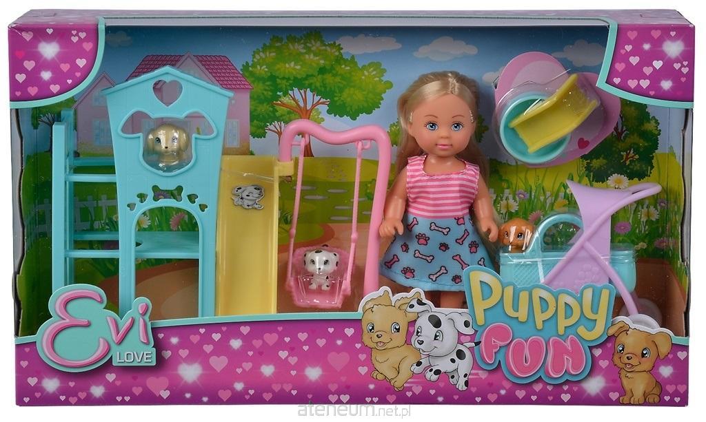 Evi otacza opieką 3 szczeniaczki na placu zabaw z huśtawką, dołączony wózek dla pupuli, wysokość lalki: 12 cm, 3l+