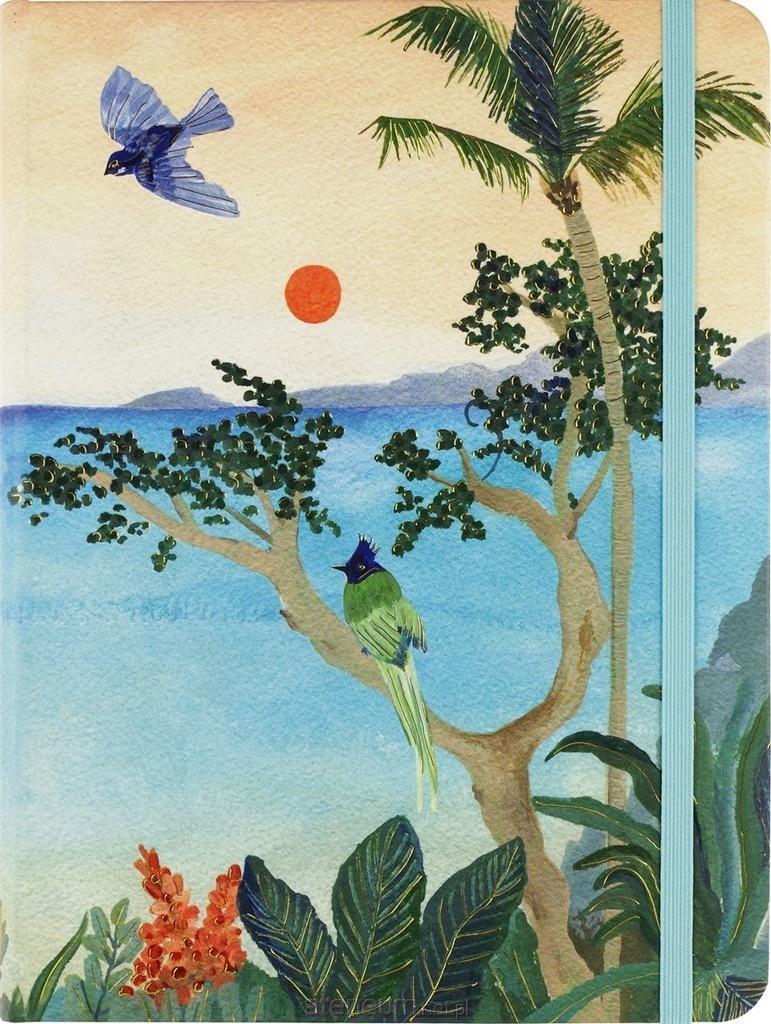 Notatnik marki Peter Pauper Press w średnim rozmiarze - Tropikalny Raj. Okładka jest sztywna, wytłaczana, zdobiona złotą folią, połyskująca. Cały notes jest zszywany i posiada zamknięcie na gumkę. Na końcu znajduje się koperta na paragony, luźne notatki. Strony zadrukowane w linie wykonane są z wysokiej jakości papieru bezkwasowego. Wymiary: 21 cm x 15,9 cm Ilość stron: 160