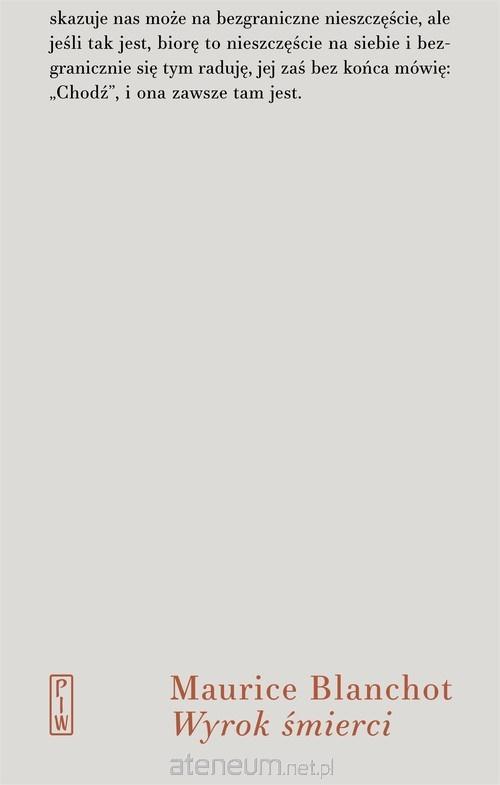 ?Pisanie jest po trosze umieraniem? ? hołdując tej zasadzie, Maurice Blanchot, jeden z wielkich samotników dwudziestowiecznej literatury, poświęcił się pisaniu. Wyrok śmierci, najsłynniejsza z jego krótkich powieści, ma pozory autobiografii, ale kiedy Blanchot pisze: ?Te wypadki przydarzyły się w 1938 roku?, nie ma rzeczy mniej pewnej niż to, kiedy i czy owe wydarzenia się rozegrały. To proza medytacyjna, skupiona na umieraniu bliskiej osoby, być może naznaczona własną chorobą autora, jego osobistym wyrokiem śmierci. Z niebywałą mocą przybliża się do śmierci i ją odsłania, jak nigdy nie uczynił żaden utwór.