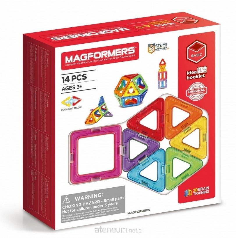 MAGFORMERS BASIC 14 to klocki z wbudowanymi silnymi magnesami neodymowymi, które zawsze się przyciągają. Wystarczy zbliżyć do siebie ściankami dwa klocki, a one natychmiast ze sobą się połączą. Za pomocą klocków wzorowanych na kształt figur geometrycznych można zbudować wspaniałe trójwymiarowe budowle. W zabawie można korzystać z dołączonej do zestawu instrukcji lub innych przykładów zamieszczonych na stronie producenta lub własnej wyobraźni. W skład zestawu wchodzi: 8 trójkątów; 6 kwadratów.