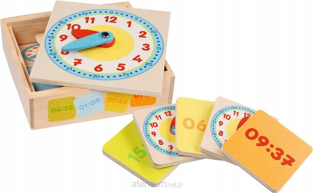 Zegar wykonany został z drewna, posiada ruchome wskazówki, a także godziny oraz minuty ułatwiające naukę. Żywe kolory oraz wesołe wzory z pewnością spodobają się każdemu maluchowi zaciekawionemu upływającym czasem. Dodatkowo zestaw posiada tabliczki, na których przedstawiony został liczbowy oraz obrazkowy zapis czasu. Zadaniem malucha jest dopasowanie odpowiednich plansz do tarczy zegara wskazującej przykładową godzinę. zegar na drewnianej tarczy z dwoma wskazówkami 12 tabliczek z przykładowymi godzinami eleganckie drewniane pudełko, będące jednocześnie schowkiem i opakowaniem