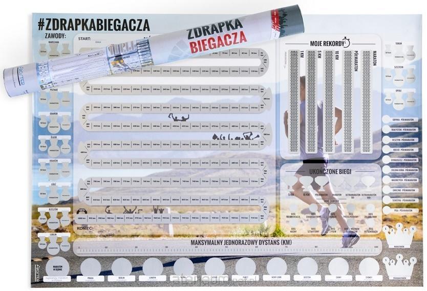 Zdrapka Biegacza to plakat z biegowymi osiągnięciami pokryty specjalną warstwą do zdrapywania. To gadżet motywujący do biegania, dzięki któremu każdy biegacz może czerpać radość ze zdrapywania przebiegniętych kilometrów, ukończonych zawodów i pobitych rekordów. Może również z dumą zaprezentować swoje wyniki innym, bo gadżet jest estetyczną i kolorową wizualizacją jego sportowych osiągnięć. Ten unikalny plakat działa tak, jak mapa zdrapka, z tą różnicą, że służy do zaznaczania biegowych sukcesów i rekordów.