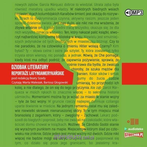 Czyta: zespół lektorów Czas trwania: 8 godzin 42 minut Dziobak to bardzo dziwny ssak: ma dziób kaczki, sierść wydry i ogon bobra. Poza tym wydziela jad i składa jaja. Dziobak jest po trosze kaczką, po trosze wydrą lub bobrem, ale żadnym z tych zwierząt do końca. I właśnie reportaż latynoamerykański jest jak taki dziobak: czerpie z wielu gatunków używa środków stylistycznych typowych dla prozy literackiej, konstruuje bohaterów jak w dramaturgii, syntetyzuje jak w poezji, surowo obserwuje jak w dziennikarstwie ale jest oddzielnym bytem. W tym zbiorze nie ma opowieści jedynie o narkotykach, nierównościach społecznych i przemocy, czyli o wszystkim tym, czego spodziewamy się po reportażach z Ameryki Łacińskiej. Opowiadać o banale w niebanalny sposób oto wyzwanie dla reportażu latynoamerykańskiego. Dostrzegać niezwykłość w tym, co zwykłe oto jego cel.